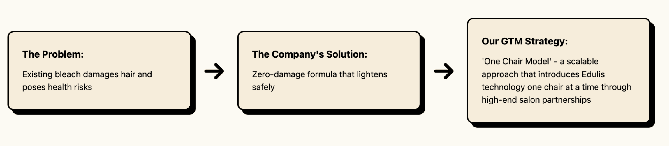 In Spring 2025, I led a four-person team at Edulis, a hair care startup, to develop a go-to-market strategy for a new beauty tech product. The project culminated in a design experience walkthrough, where founders flew in to see our proposed ‘One Chair Model’—a scalable approach that partners with high-end salons by introducing a single Edulis chair as the entry point. Using a six-phase timeline, user research, and targeted partnership outreach, we secured founder adoption for the 2026 launch and achieved strategic brand alignment.