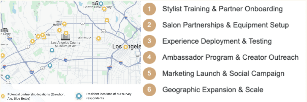 With our brand positioning established, we developed a six-phase launch strategy. Using a geographic-demographic approach, I identified high-density customer areas in West LA and pursued partnerships with brands targeting similar demographics. This ensured our launch met users where they lived and shopped while building partnerships grounded in shared brand values, authentic connections, and customer accessibility.