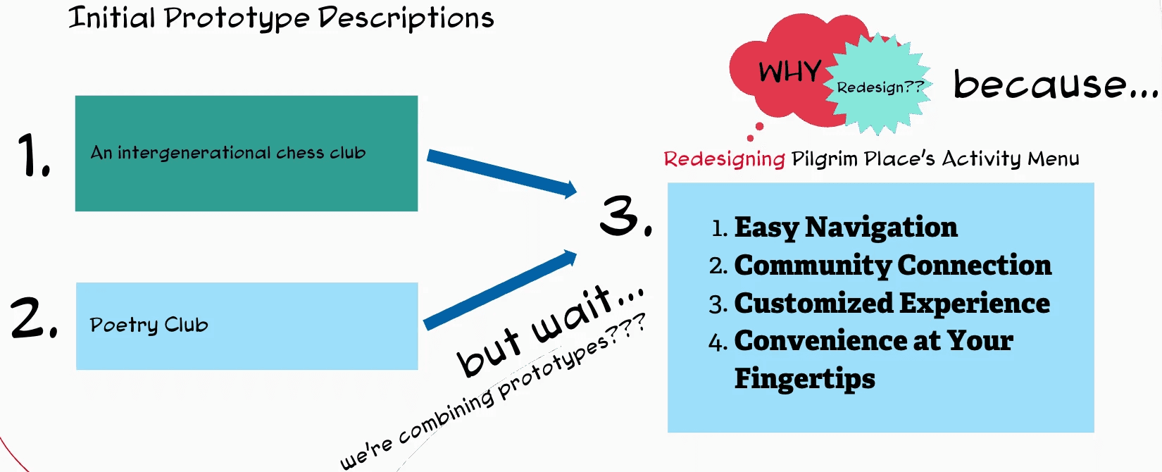 Stakeholder Validation: I presented our redesigned activities menu prototype to key project stakeholders, including supervising professors, Pilgrim Place management, current residents, and representatives from our original user persona interviews. This comprehensive feedback session allowed us to validate both our pivot rationale and our design approach with the people who would be most impacted by the solution.
